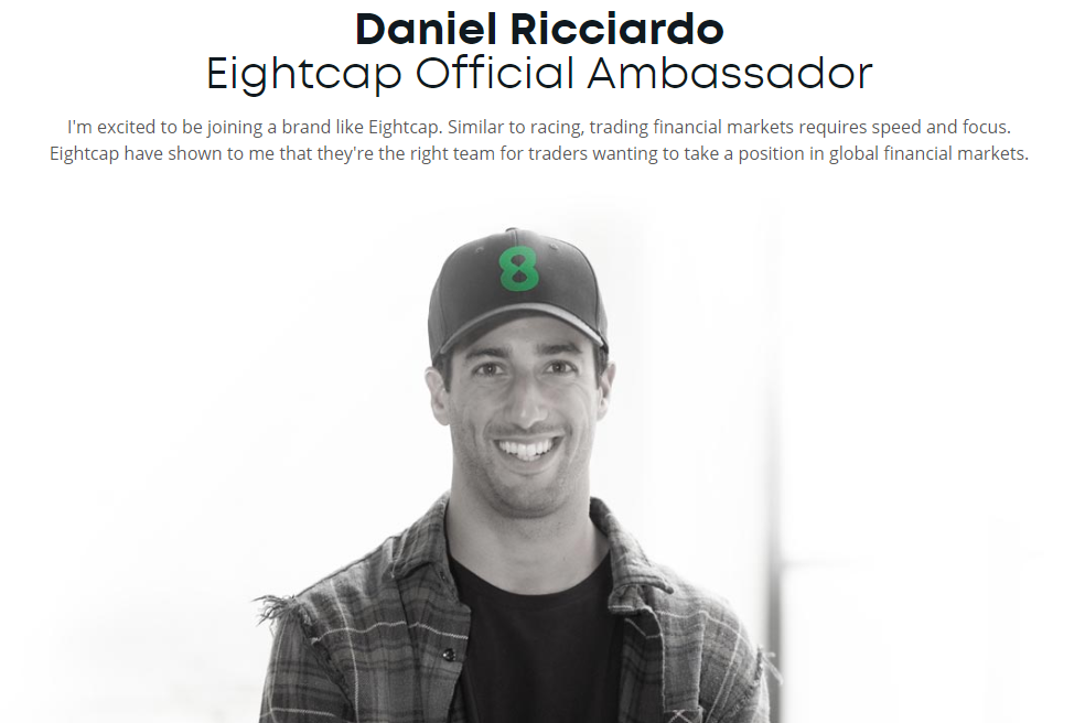 EightCap易匯為人所知的其中一項原因為他們在2018年邀請了F1賽車手Daniel Ricciardo成為公司的品牌形像大使至今。